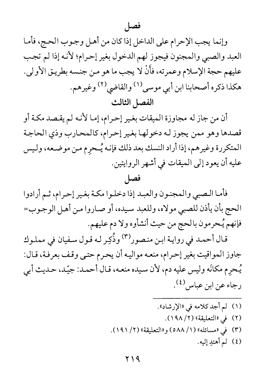 وإنما يجب الإحرام على الداخل إذا كان من أهل وجوب الحج، فأما العبد والصبي والمجنون فيجوز لهم الدخول بغير إحرام؛ لأنه إذا لم تجب عليهم حجة الإسلام وعمرته، فأَنْ لا يجب ما هو من جنسه بطريق الأولى. هكذا ذكره أصحابنا ابن أبي موسى (¬١) والقاضي (¬٢) وغيرهم.