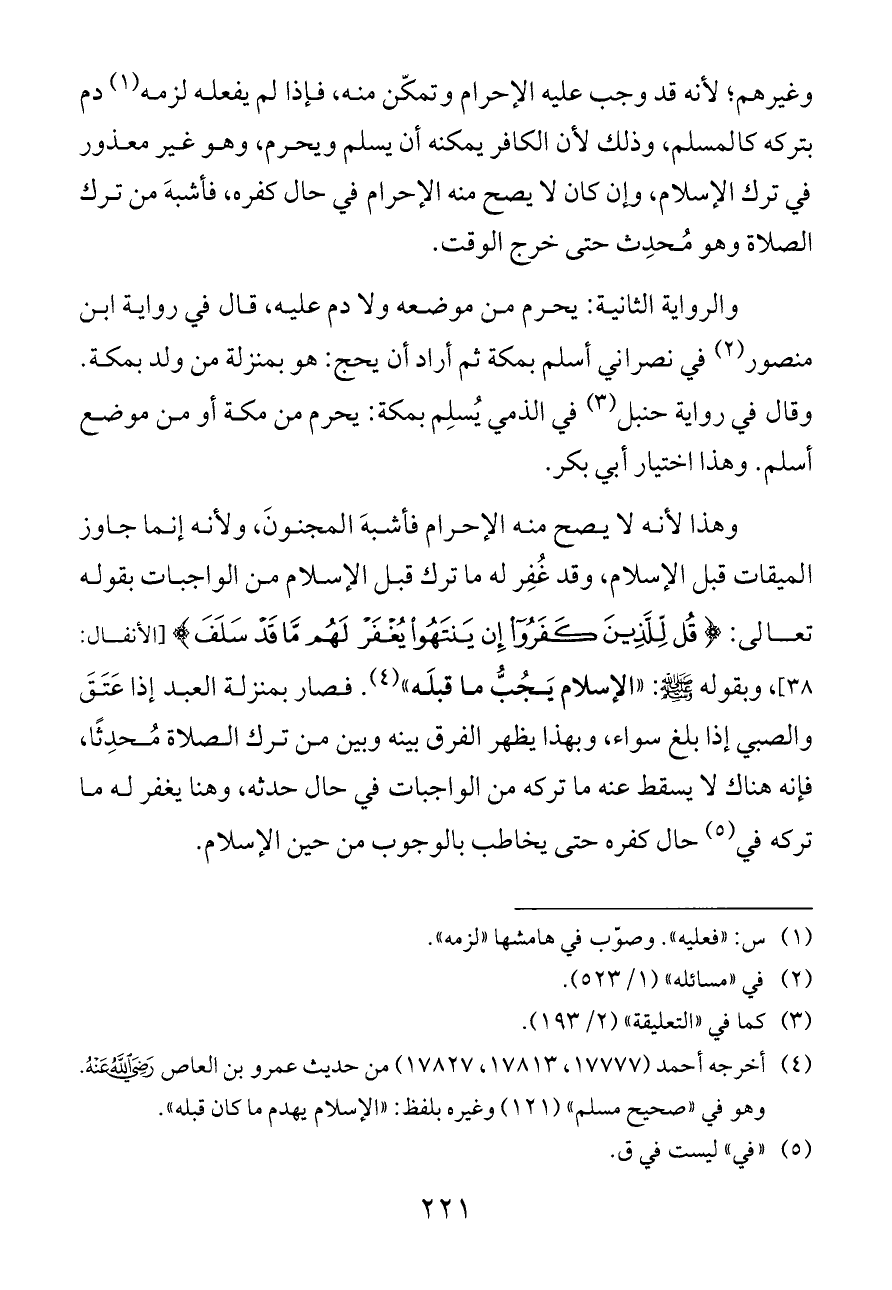والرواية الثانية: يحرم من موضعه ولا دم عليه، قال في رواية ابن منصور (¬٢) في نصراني أسلم بمكة ثم أراد أن يحج: هو بمنزلة من ولد بمكة. وقال في رواية حنبل (¬٣) في الذمي يُسلِم بمكة: يحرم من مكة أو من موضع أسلم. وهذا اختيار أبي بكر.