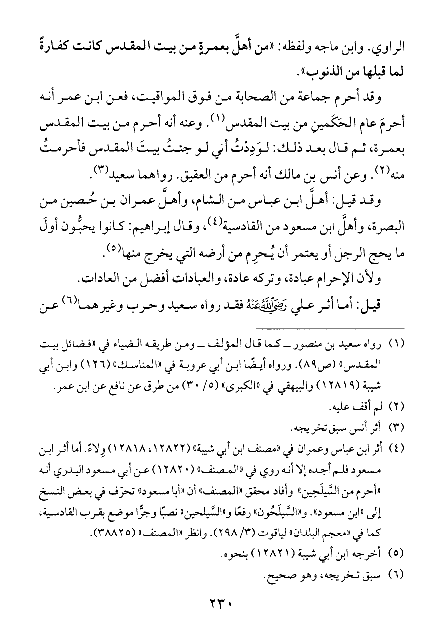 (¬٤) أثر ابن عباس وعمران في «مصنف ابن أبي شيبة» (١٢٨٢٢، ١٢٨١٨) وِلاءً. أما أثر ابن مسعود فلم أجده إلا أنه روي في «المصنف» (١٢٨٢٠) عن أبي مسعود البدري أنه «أحرم من السَّيلَحِين» وأفاد محقق «المصنف» أن «أبا مسعود» تحرّف في بعض النسخ إلى «ابن مسعود». و «السَّيلَحُون» رفعًا و «السَّيلحين» نصبًا وجرًّا موضع بقرب القادسية، كما في «معجم البلدان» لياقوت (٣/ ٢٩٨). وانظر «المصنف» (٣٨٨٢٥).