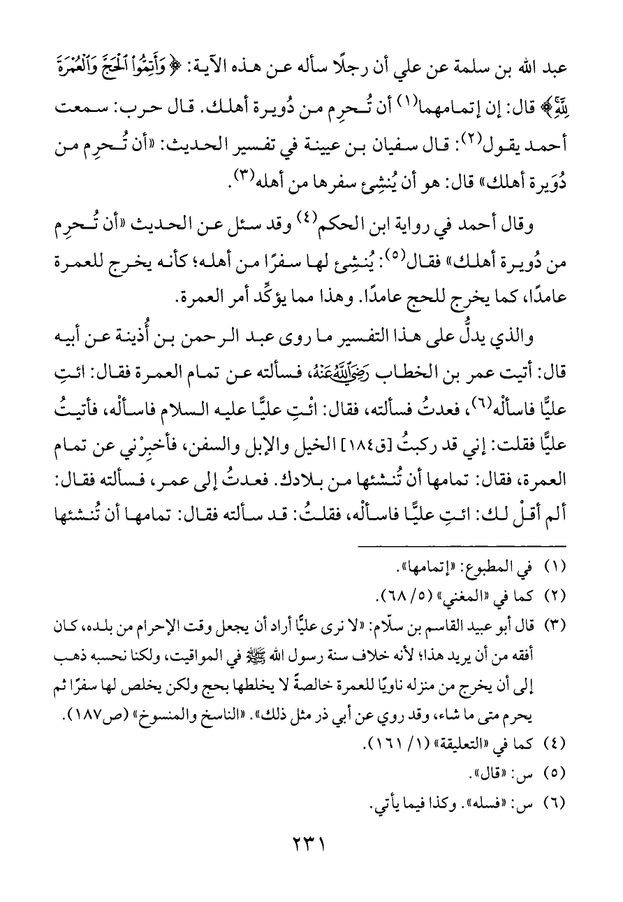 عبد الله بن سلمة عن علي أن رجلًا سأله عن هذه الآية: {وَأَتِمُّوا الْحَجَّ وَالْعُمْرَةَ لِلَّهِ} قال: إن إتمامهما (¬١) أن تُحرِم من دُويرة أهلك. قال حرب: سمعت أحمد يقول (¬٢): قال سفيان بن عيينة في تفسير الحديث: «أن تُحرِم من دُوَيرة أهلك» قال: هو أن يُنشِئ سفرها من أهله (¬٣).