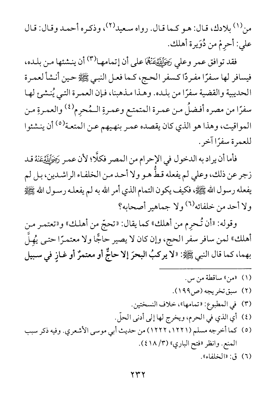 فقد توافق عمر وعلي - رضي الله عنهما - على أن إتمامها (¬٣) أن ينشئها من بلده، فيسافر لها سفرًا مفردًا كسفر الحج، كما فعل النبي - صلى الله عليه وسلم - حين أنشأ لعمرة الحديبية والقضية سفرًا من بلده. وهذا مذهبنا، فإن العمرة التي يُنشئ لها سفرًا من مصره أفضلُ من عمرة المتمتع وعمرةِ المُحرِم (¬٤) والعمرةِ من المواقيت، وهذا هو الذي كان يقصده عمر بنهيهم عن المتعة (¬٥) أن ينشئوا للعمرة سفرًا آخر.