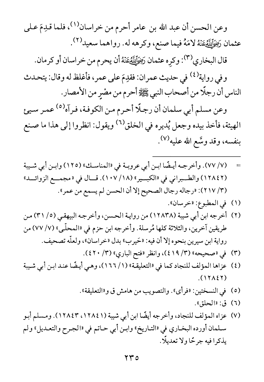 وعن الحسن أن عبد الله بن عامر أحرم من خراسان (¬١)، فلما قدِمَ على عثمان - رضي الله عنه - لامَهُ فيما صنع، وكرهه له. رواهما سعيد (¬٢).