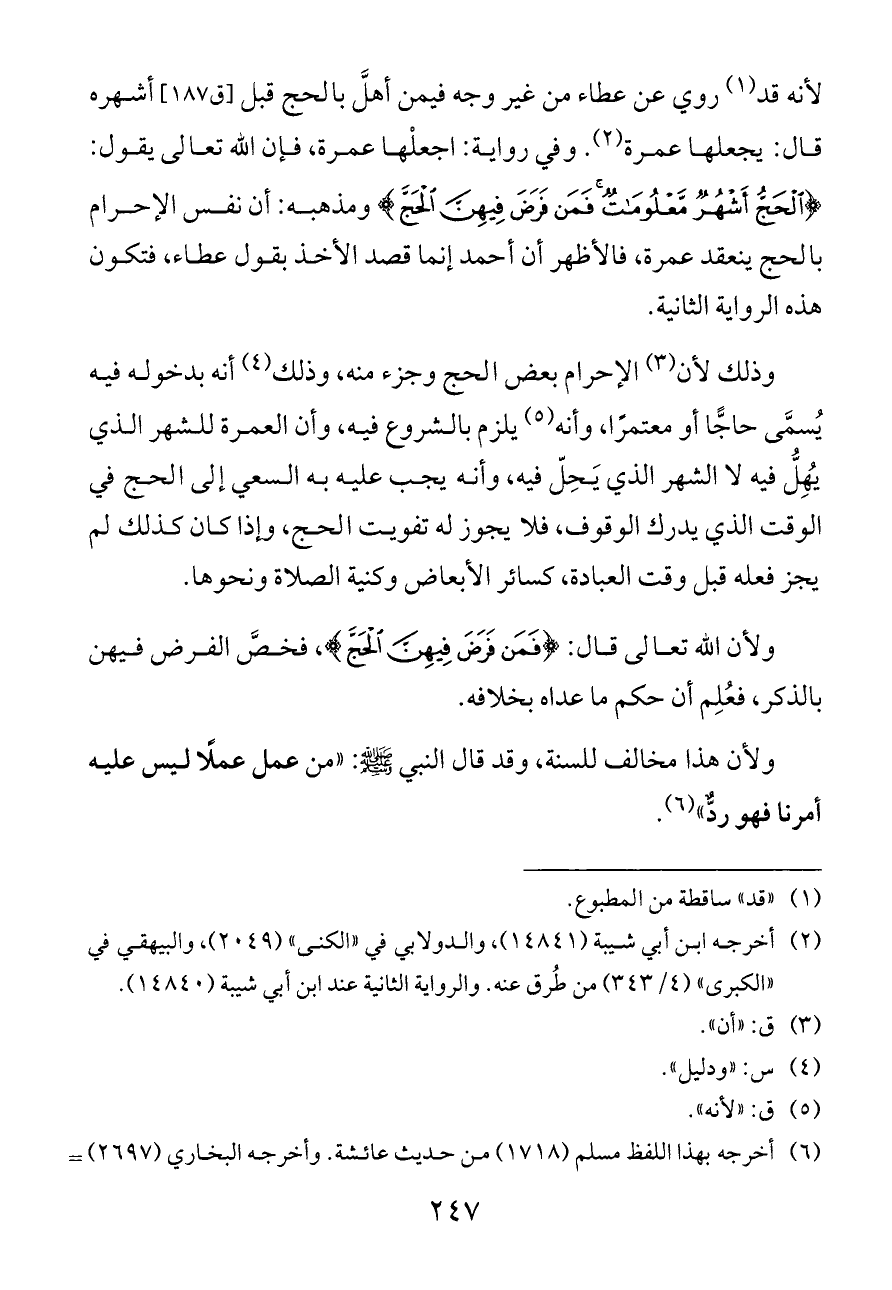 لأنه قد (¬١) روي عن عطاء من غير وجه فيمن أهلَّ بالحج قبل [ق ١٨٧] أشهره قال: يجعلها عمرة (¬٢). وفي رواية: اجعلْها عمرة، فإن الله تعالى يقول: {الْحَجُّ أَشْهُرٌ مَعْلُومَاتٌ فَمَنْ فَرَضَ فِيهِنَّ الْحَجَّ} ومذهبه: أن نفس الإحرام بالحج ينعقد عمرة، فالأظهر أن أحمد إنما قصد الأخذ بقول عطاء، فتكون هذه الرواية الثانية.