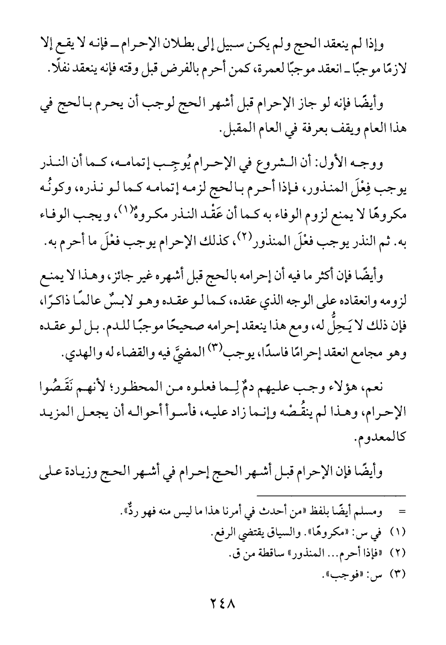 وأيضًا فإن أكثر ما فيه أن إحرامه بالحج قبل أشهره غير جائز، وهذا لا يمنع لزومه وانعقاده على الوجه الذي عقده، كما لو عقده وهو لابسٌ عالمًا ذاكرًا، فإن ذلك لا يَحِلُّ له، ومع هذا ينعقد إحرامه صحيحًا موجبًا للدم. بل لو عقده وهو مجامع انعقد إحرامًا فاسدًا، يوجب (¬٣) المضيَّ فيه والقضاء له والهدي.