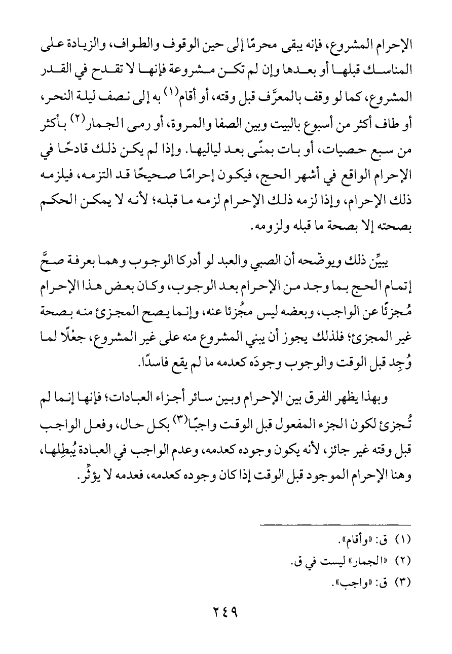 الإحرام المشروع، فإنه يبقى محرمًا إلى حين الوقوف والطواف، والزيادة على المناسك قبلها أو بعدها وإن لم تكن مشروعة فإنها لا تقدح في القدر المشروع، كما لو وقف بالمعرَّف قبل وقته، أو أقام (¬١) به إلى نصف ليلة النحر، أو طاف أكثر من أسبوع بالبيت وبين الصفا والمروة، أو رمى الجمار (¬٢) بأكثر من سبع حصيات، أو بات بمنًى بعد لياليها. وإذا لم يكن ذلك قادحًا في الإحرام الواقع في أشهر الحج، فيكون إحرامًا صحيحًا قد التزمه، فيلزمه ذلك الإحرام، وإذا لزمه ذلك الإحرام لزمه ما قبله؛ لأنه لا يمكن الحكم بصحته إلا بصحة ما قبله ولزومه.