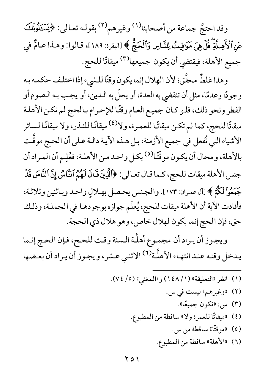 وقد احتجَّ جماعة من أصحابنا (¬١) وغيرهم (¬٢) بقوله تعالى: {يَسْأَلُونَكَ عَنِ الْأَهِلَّةِ قُلْ هِيَ مَوَاقِيتُ لِلنَّاسِ وَالْحَجِّ} [البقرة: ١٨٩]، قالوا: وهذا عامٌّ في جميع الأهلة، فيقتضي أن يكون جميعها (¬٣) ميقاتًا للحج.