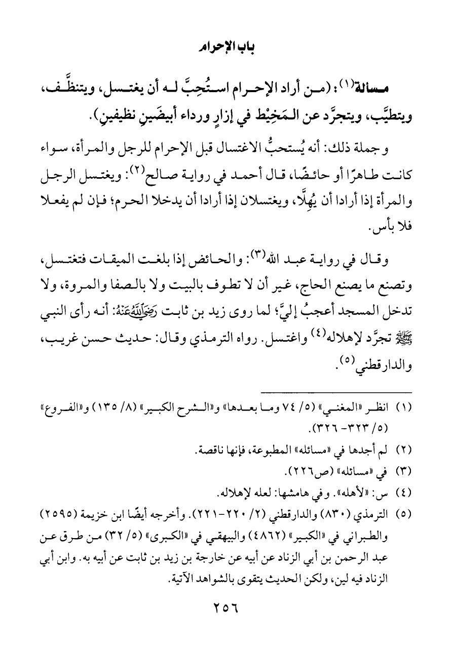 وقال في رواية عبد الله (¬٣): والحائض إذا بلغت الميقات فتغتسل، وتصنع ما يصنع الحاج، غير أن لا تطوف بالبيت ولا بالصفا والمروة، ولا تدخل المسجد أعجبُ إليَّ؛ لما روى زيد بن ثابت - رضي الله عنه -: أنه رأى النبي - صلى الله عليه وسلم - تجرَّد لإهلاله (¬٤) واغتسل. رواه الترمذي وقال: حديث حسن غريب، والدارقطني (¬٥).