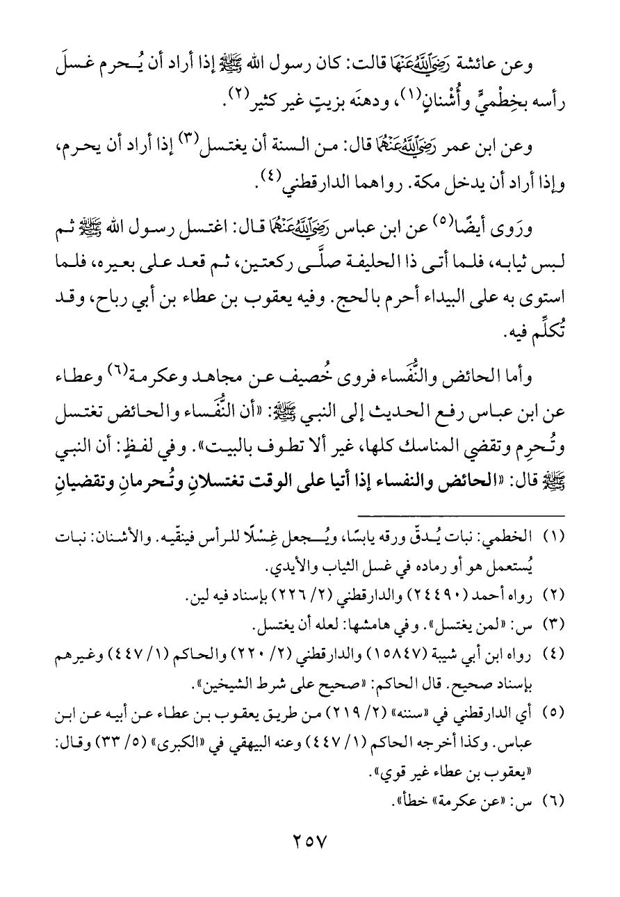 وعن ابن عمر - رضي الله عنهما - قال: من السنة أن يغتسل (¬٣) إذا أراد أن يحرم، وإذا أراد أن يدخل مكة. رواهما الدارقطني (¬٤).