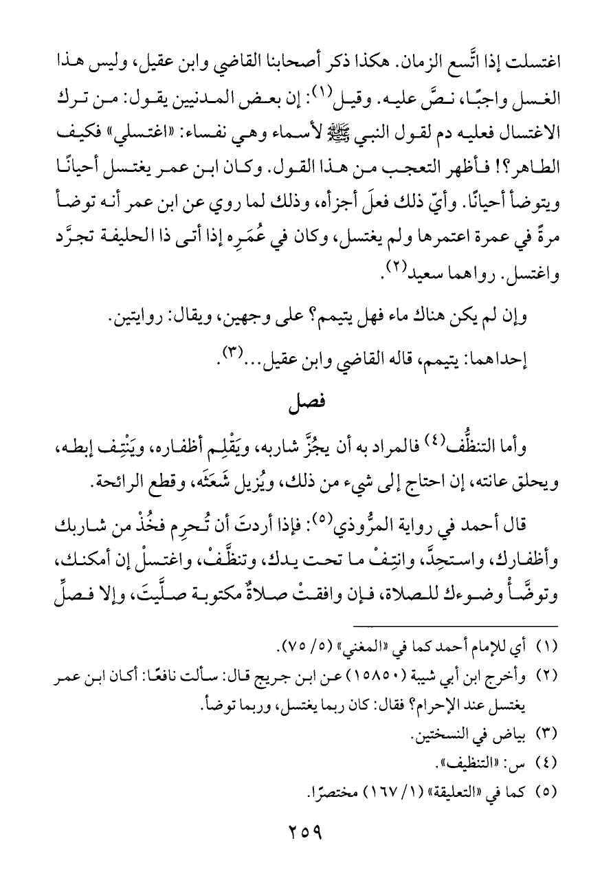 اغتسلت إذا اتَّسع الزمان. هكذا ذكر أصحابنا القاضي وابن عقيل، وليس هذا الغسل واجبًا، نصَّ عليه. وقيل (¬١): إن بعض المدنيين يقول: من ترك الاغتسال فعليه دم لقول النبي - صلى الله عليه وسلم - لأسماء وهي نفساء: «اغتسلي» فكيف الطاهر؟! فأظهر التعجب من هذا القول. وكان ابن عمر يغتسل أحيانًا ويتوضأ أحيانًا. وأيّ ذلك فعلَ أجزأه، وذلك لما روي عن ابن عمر أنه توضأ مرةً في عمرة اعتمرها ولم يغتسل، وكان في عُمَرِه إذا أتى ذا الحليفة تجرَّد واغتسل. رواهما سعيد (¬٢).
