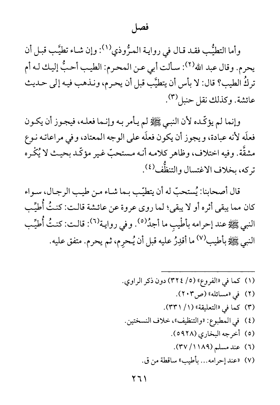 وأما التطيُّب فقد قال في رواية المرُّوذي (¬١): وإن شاء تطيَّب قبل أن يحرم. وقال عبد الله (¬٢): سألت أبي عن المحرم: الطيب أحبُّ إليك له أم تركُ الطيب؟ قال: لا بأس أن يتطيَّب قبل أن يحرم، ونذهب فيه إلى حديث عائشة. وكذلك نقل حنبل (¬٣).