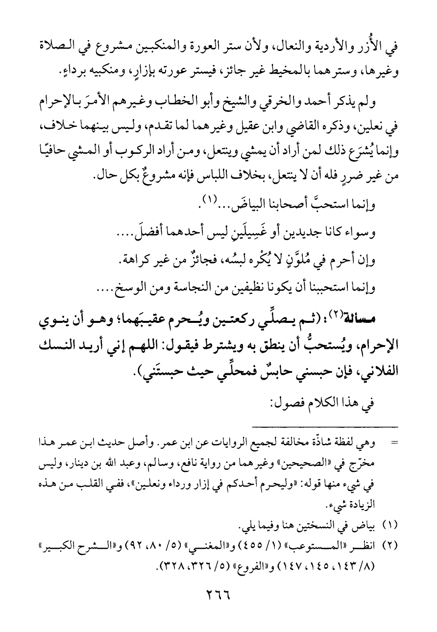 ولم يذكر أحمد والخرقي والشيخ وأبو الخطاب وغيرهم الأمرَ بالإحرام في نعلين، وذكره القاضي وابن عقيل وغيرهما لما تقدم، وليس بينهما خلاف، وإنما يُشرَع ذلك لمن أراد أن يمشي وينتعل، ومن أراد الركوب أو المشي حافيًا من غير ضررٍ فله أن لا ينتعل، بخلاف اللباس فإنه مشروعٌ بكل حال.