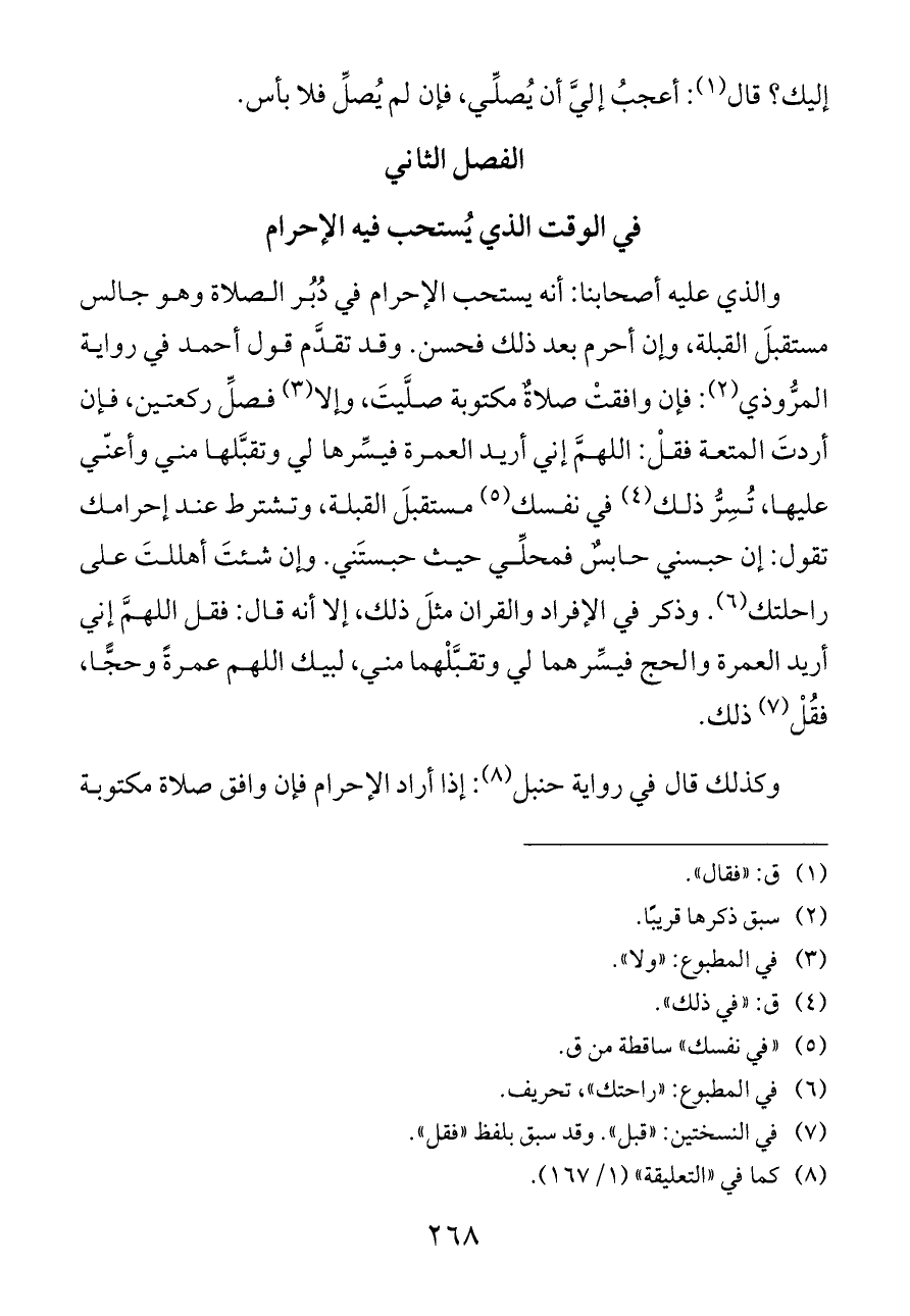 والذي عليه أصحابنا: أنه يستحب الإحرام في دُبُر الصلاة وهو جالس مستقبلَ القبلة، وإن أحرم بعد ذلك فحسن. وقد تقدَّم قول أحمد في رواية المرُّوذي (¬٢): فإن وافقتْ صلاةٌ مكتوبة صلَّيتَ، وإلا (¬٣) فصلِّ ركعتين، فإن أردتَ المتعة فقلْ: اللهمَّ إني أريد العمرة فيسِّرها لي وتقبَّلها مني وأعنّي عليها، تُسِرُّ ذلك (¬٤) في نفسك (¬٥) مستقبلَ القبلة، وتشترط عند إحرامك تقول: إن حبسني حابسٌ فمحلِّي حيث حبستَني. وإن شئتَ أهللتَ على راحلتك (¬٦). وذكر في الإفراد والقران مثلَ ذلك، إلا أنه قال: فقل اللهمَّ إني أريد العمرة والحج فيسِّرهما لي وتقبَّلْهما مني، لبيك اللهم عمرةً وحجًّا، فقُلْ (¬٧) ذلك.