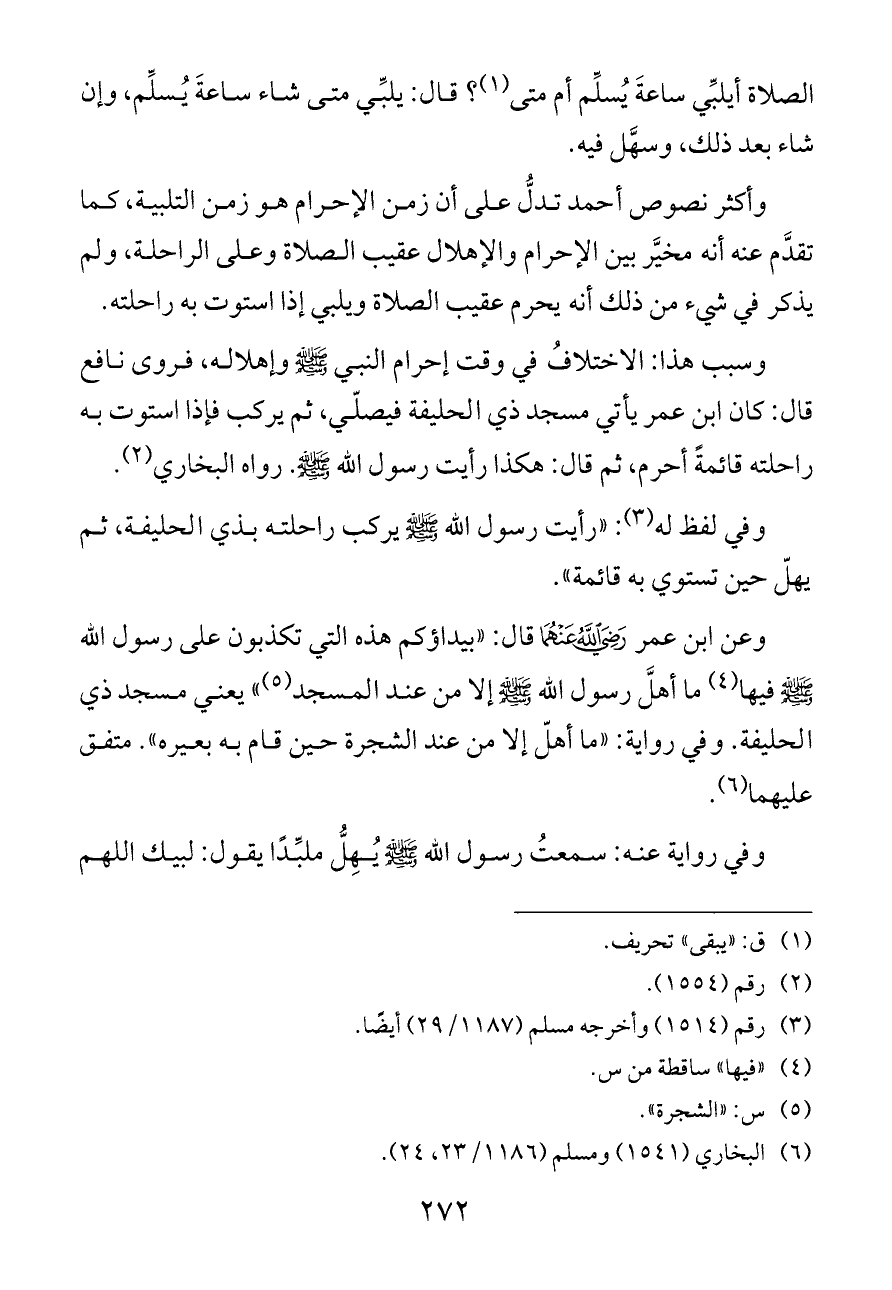 وأكثر نصوص أحمد تدلُّ على أن زمن الإحرام هو زمن التلبية، كما تقدَّم عنه أنه مخيَّر بين الإحرام والإهلال عقيب الصلاة وعلى الراحلة، ولم يذكر في شيء من ذلك أنه يحرم عقيب الصلاة ويلبي إذا استوت به راحلته.