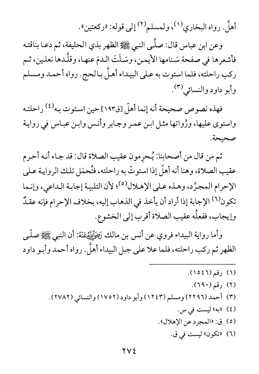 فهذه نصوص صحيحة أنه إنما أهلّ [ق ١٩٣] حين استوت به (¬٤) راحلته واستوى عليها، ورُواتها مثل ابن عمر وجابر وأنس وابن عباس في رواية صحيحة.