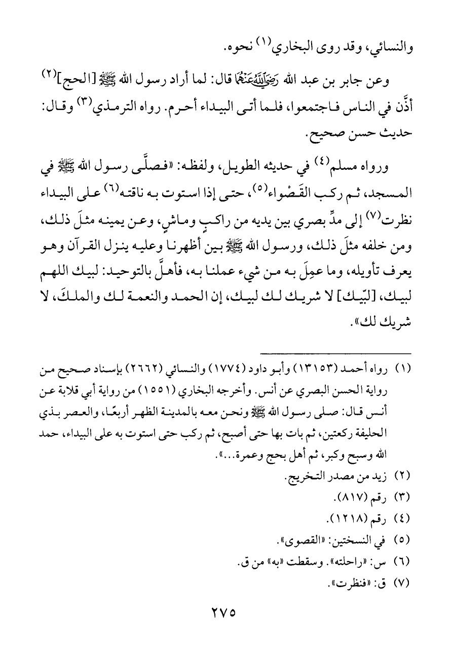 (¬١) رواه أحمد (١٣١٥٣) وأبو داود (١٧٧٤) والنسائي (٢٦٦٢) بإسناد صحيح من رواية الحسن البصري عن أنس. وأخرجه البخاري (١٥٥١) من رواية أبي قلابة عن أنس قال: صلى رسول الله - صلى الله عليه وسلم - ونحن معه بالمدينة الظهر أربعًا، والعصر بذي الحليفة ركعتين، ثم بات بها حتى أصبح، ثم ركب حتى استوت به على البيداء، حمد الله وسبح وكبر، ثم أهل بحج وعمرة ... ».