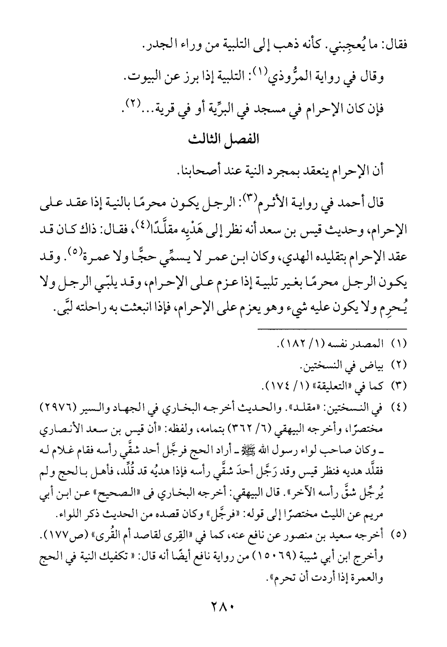 قال أحمد في رواية الأثرم (¬٣): الرجل يكون محرمًا بالنية إذا عقد على الإحرام، وحديث قيس بن سعد أنه نظر إلى هَدْيِه مقلَّدًا (¬٤)، فقال: ذاك كان قد عقد الإحرام بتقليده الهدي، وكان ابن عمر لا يسمِّي حجًّا ولا عمرة (¬٥). وقد يكون الرجل محرمًا بغير تلبية إذا عزم على الإحرام، وقد يلبّي الرجل ولا يُحرِم ولا يكون عليه شيء وهو يعزم على الإحرام، فإذا انبعثت به راحلته لبَّى.