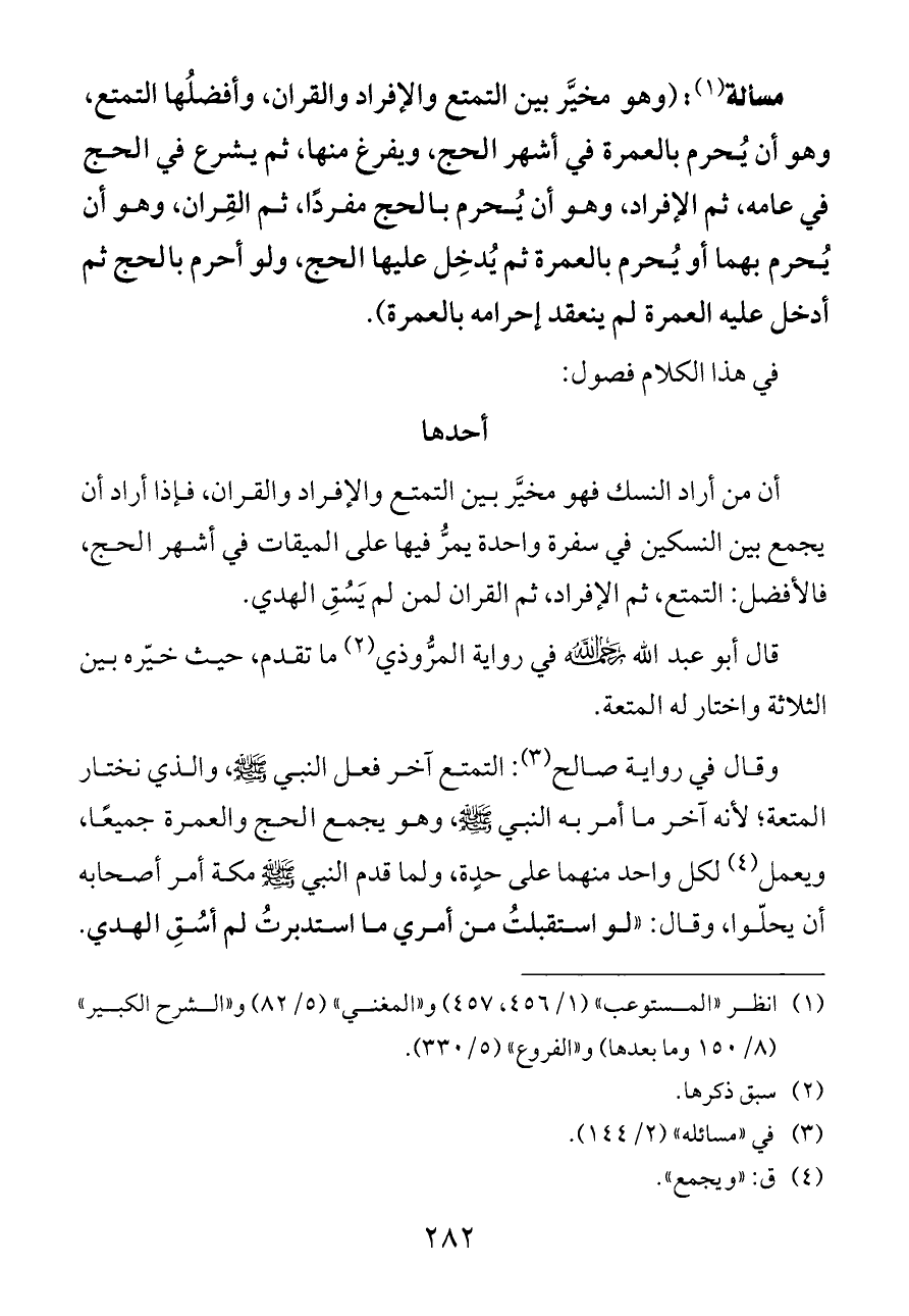 قال أبو عبد الله - رحمه الله - في رواية المرُّوذي (¬٢) ما تقدم، حيث خيّره بين الثلاثة واختار له المتعة.