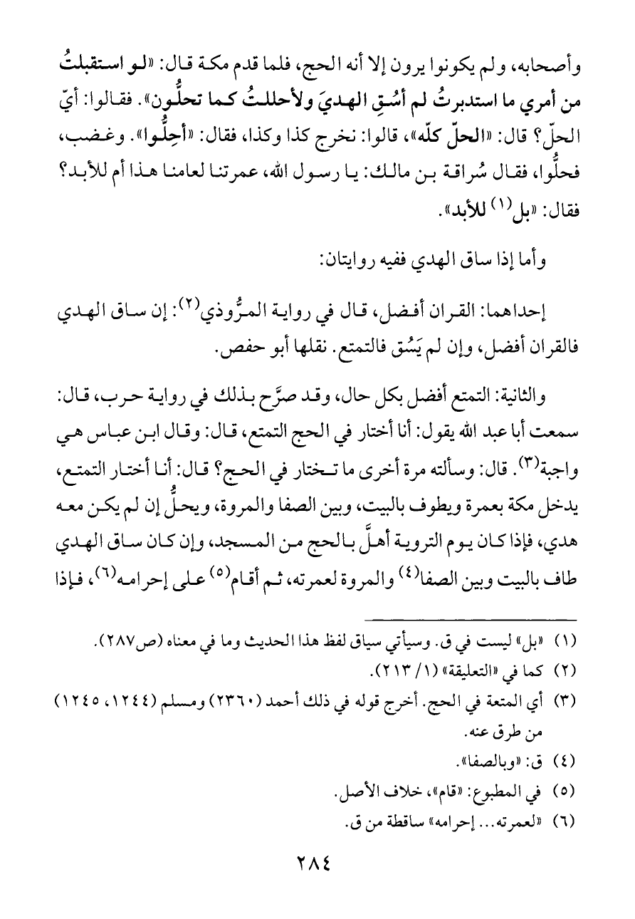وأصحابه، ولم يكونوا يرون إلا أنه الحج، فلما قدم مكة قال: «لو استقبلتُ من أمري ما استدبرتُ لم أسُقِ الهديَ ولأحللتُ كما تحلُّون». فقالوا: أيّ الحلّ؟ قال: «الحلّ كلّه»، قالوا: نخرج كذا وكذا، فقال: «أحِلُّوا». وغضب، فحلُّوا، فقال سُراقة بن مالك: يا رسول الله، عمرتنا لعامنا هذا أم للأبد؟ فقال: «بل (¬١) للأبد».
