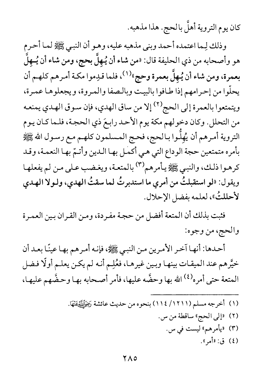 وذلك لِما اعتمده أحمد وبنى مذهبه عليه، وهو أن النبي - صلى الله عليه وسلم - لما أحرم هو وأصحابه من ذي الحليفة قال: «من شاء أن يُهِلَّ بحج، ومن شاء أن يُهِلَّ بعمرة، ومن شاء أن يُهِلَّ بعمرة وحج» (¬١)، فلما قدِموا مكة أمرهم كلهم أن يحلّوا من إحرامهم إذا طافوا بالبيت وبالصفا والمروة، ويجعلوها عمرة، ويتمتعوا بالعمرة إلى الحج (¬٢) إلا من ساق الهدي، فإن سوق الهدي يمنعه من التحلل. وكان دخولهم مكة يوم الأحد رابعَ ذي الحجة، فلما كان يوم التروية أمرهم أن يُهِلُّوا بالحج، فحج المسلمون كلهم مع رسول الله - صلى الله عليه وسلم - بأمره متمتعين حجة الوداع التي هي أكمل بها الدين وأتمّ بها النعمة، وقد كرهوا ذلك، والنبي - صلى الله عليه وسلم - يأمرهم (¬٣) بالمتعة، ويغضب على من لم يفعلها ويقول: «لو استقبلتُ من أمري ما استدبرتُ لما سقتُ الهدي، ولولا الهدي لأحللتُ»، لعلمه بفضل الإحلال.