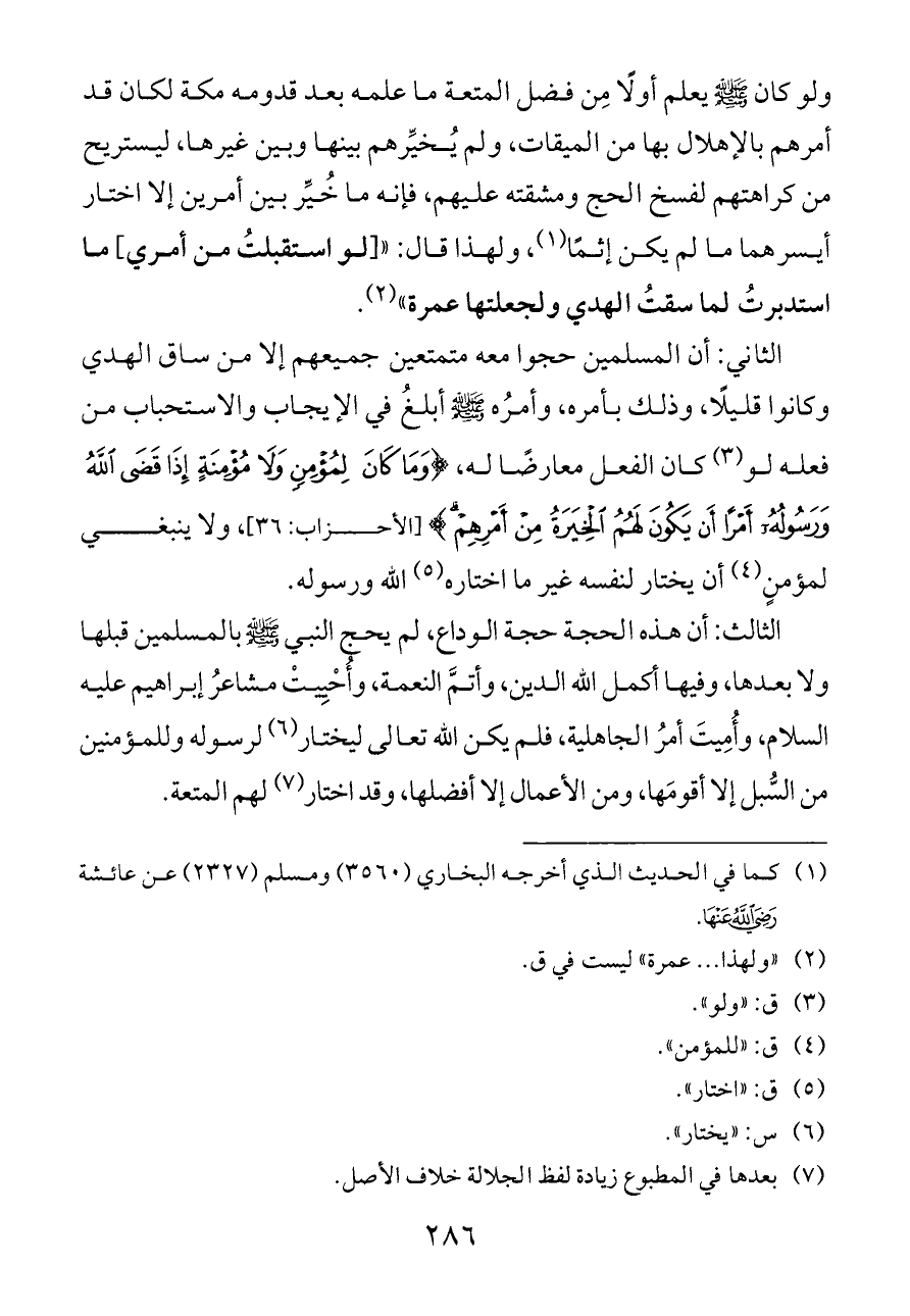 ولو كان - صلى الله عليه وسلم - يعلم أولًا مِن فضل المتعة ما علمه بعد قدومه مكة لكان قد أمرهم بالإهلال بها من الميقات، ولم يُخيِّرهم بينها وبين غيرها، ليستريح من كراهتهم لفسخ الحج ومشقته عليهم، فإنه ما خُيِّر بين أمرين إلا اختار أيسرهما ما لم يكن إثمًا (¬١)، ولهذا قال: «[لو استقبلتُ من أمري] ما استدبرتُ لما سقتُ الهدي ولجعلتها عمرة» (¬٢).