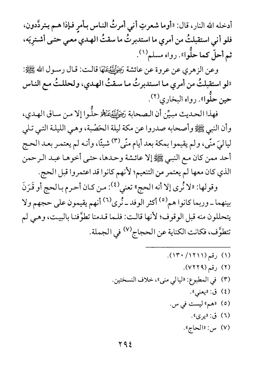 أدخله الله النار، قال: «أوما شعرتِ أني أمرتُ الناس بأمرٍ فإذا هم يتردَّدون، فلو أني استقبلتُ من أمري ما استدبرتُ ما سقتُ الهدي معي حتى أشترِيَه، ثم أحلّ كما حلُّوا». رواه مسلم (¬١).