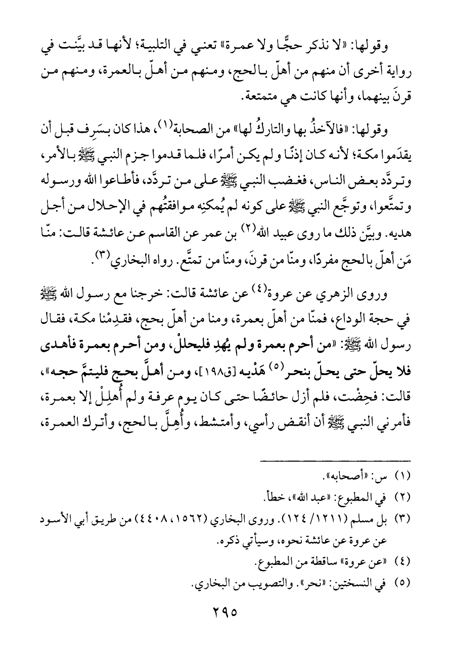 وقولها: «فالآخذُ بها والتاركُ لها» من الصحابة (¬١)، هذا كان بسَرِف قبل أن يقدَموا مكة؛ لأنه كان إذنًا ولم يكن أمرًا، فلما قدموا جزم النبي - صلى الله عليه وسلم - بالأمر، وتردَّد بعض الناس، فغضب النبي - صلى الله عليه وسلم - على من تردَّد، فأطاعوا الله ورسوله وتمتَّعوا، وتوجَّع النبي - صلى الله عليه وسلم - على كونه لم يُمكنِه موافقتُهم في الإحلال من أجل هديه. وبيَّن ذلك ما روى عبيد الله (¬٢) بن عمر عن القاسم عن عائشة قالت: منّا مَن أهلّ بالحج مفردًا، ومنّا من قرنَ، ومنّا من تمتَّع. رواه البخاري (¬٣).
