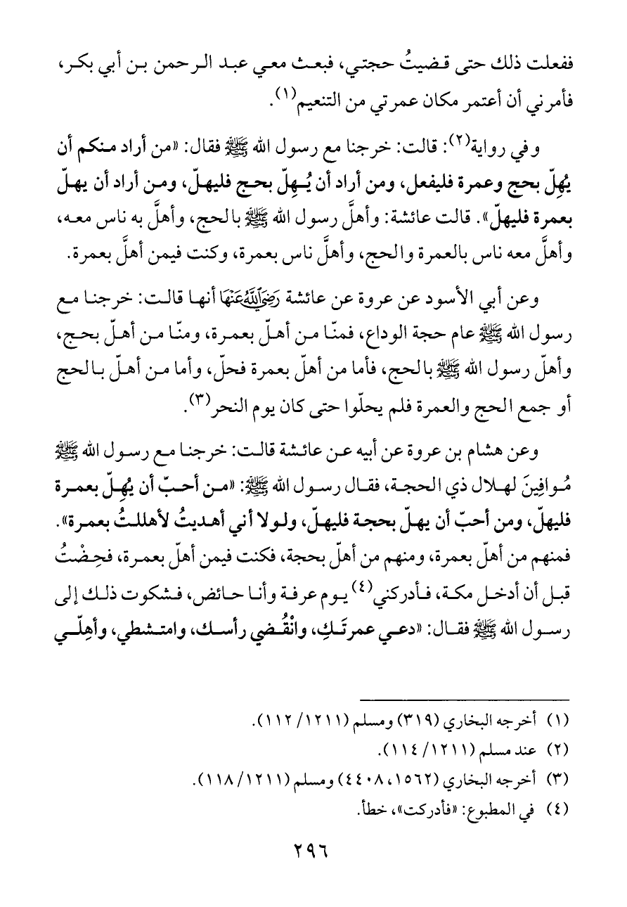 وعن هشام بن عروة عن أبيه عن عائشة قالت: خرجنا مع رسول الله - صلى الله عليه وسلم - مُوافِينَ لهلال ذي الحجة، فقال رسول الله - صلى الله عليه وسلم -: «من أحبّ أن يُهِلّ بعمرة فليهلّ، ومن أحبّ أن يهلّ بحجة فليهلّ، ولولا أني أهديتُ لأهللتُ بعمرة». فمنهم من أهلّ بعمرة، ومنهم من أهلّ بحجة، فكنت فيمن أهلّ بعمرة، فحِضْتُ قبل أن أدخل مكة، فأدركني (¬٤) يوم عرفة وأنا حائض، فشكوت ذلك إلى رسول الله - صلى الله عليه وسلم - فقال: «دعي عمرتَكِ، وانْقُضي رأسك، وامتشطي، وأهِلّي