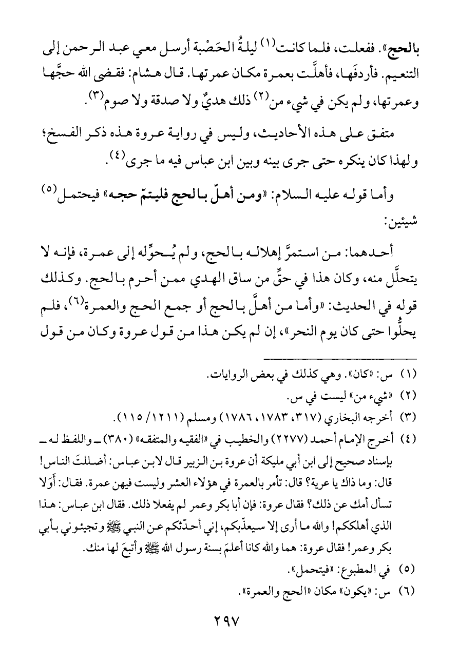 متفق على هذه الأحاديث، وليس في رواية عروة هذه ذكر الفسخ؛ ولهذا كان ينكره حتى جرى بينه وبين ابن عباس فيه ما جرى (¬٤).