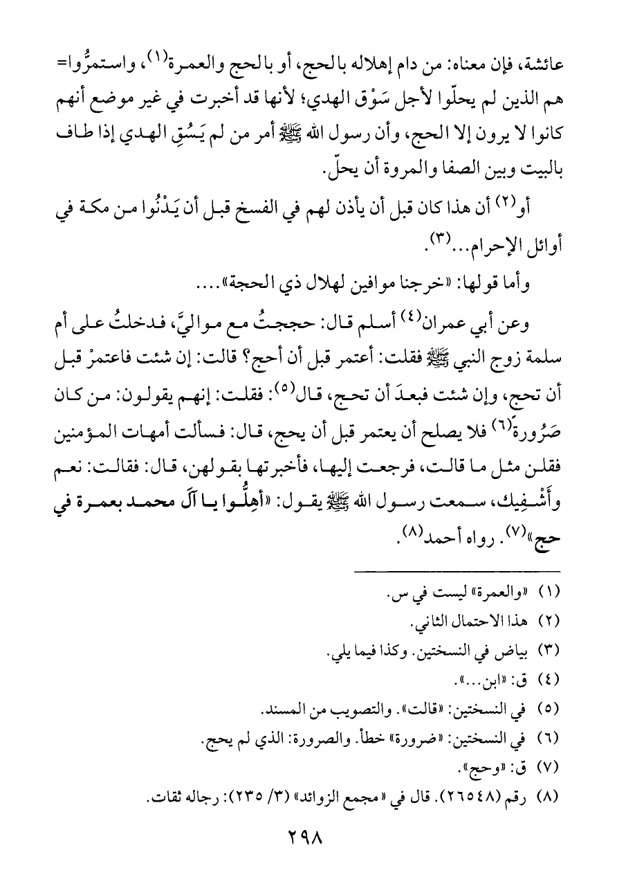 وعن أبي عمران (¬٤) أسلم قال: حججتُ مع مواليَّ، فدخلتُ على أم سلمة زوج النبي - صلى الله عليه وسلم - فقلت: أعتمر قبل أن أحج؟ قالت: إن شئت فاعتمرْ قبل أن تحج، وإن شئت فبعدَ أن تحج، قال (¬٥): فقلت: إنهم يقولون: من كان صَرُورةً (¬٦) فلا يصلح أن يعتمر قبل أن يحج، قال: فسألت أمهات المؤمنين فقلن مثل ما قالت، فرجعت إليها، فأخبرتها بقولهن، قال: فقالت: نعم وأَشْفِيك، سمعت رسول الله - صلى الله عليه وسلم - يقول: «أهِلُّوا يا آلَ محمد بعمرة في حج» (¬٧). رواه أحمد (¬٨).