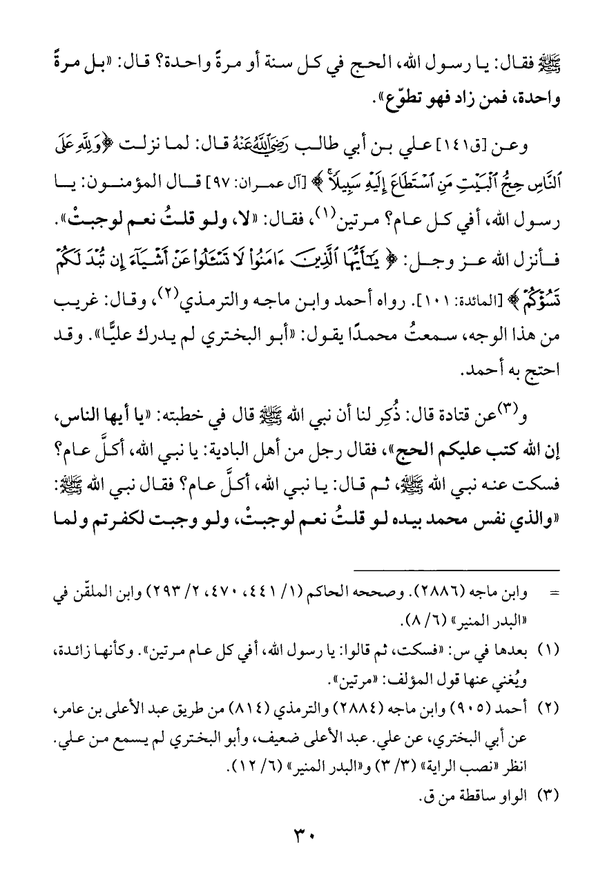 وعن [ق ١٤١] علي بن أبي طالب - رضي الله عنه - قال: لما نزلت {وَلِلَّهِ عَلَى النَّاسِ حِجُّ الْبَيْتِ مَنِ اسْتَطَاعَ إِلَيْهِ سَبِيلًا} [آل عمران: ٩٧] قال المؤمنون: يا رسول الله، أفي كل عام؟ مرتين (¬١)، فقال: «لا، ولو قلتُ نعم لوجبتْ». فأنزل الله عز وجل: {يَاأَيُّهَا الَّذِينَ آمَنُوا لَا تَسْأَلُوا عَنْ أَشْيَاءَ إِنْ تُبْدَ لَكُمْ تَسُؤْكُمْ} [المائدة: ١٠١]. رواه أحمد وابن ماجه والترمذي (¬٢)، وقال: غريب من هذا الوجه، سمعتُ محمدًا يقول: «أبو البختري لم يدرك عليًّا». وقد احتج به أحمد.
