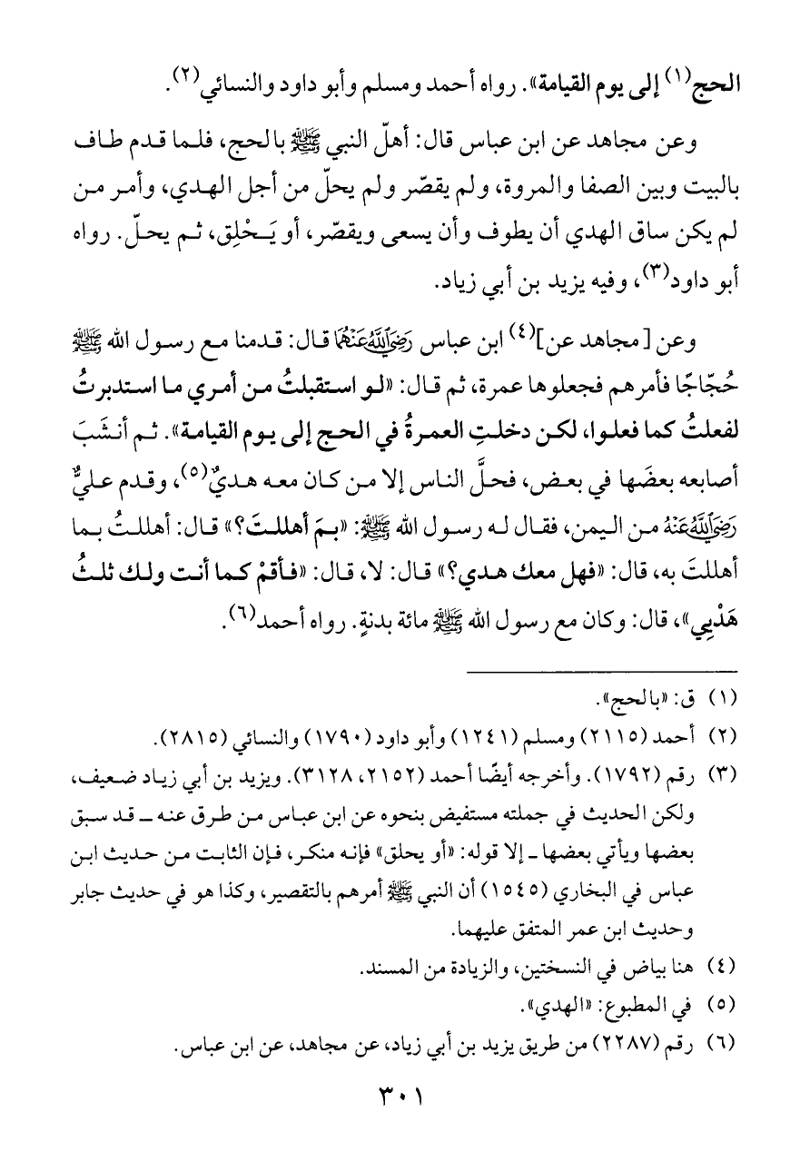 وعن [مجاهد عن] (¬٤) ابن عباس - رضي الله عنهما - قال: قدمنا مع رسول الله - صلى الله عليه وسلم - حُجّاجًا فأمرهم فجعلوها عمرة، ثم قال: «لو استقبلتُ من أمري ما استدبرتُ لفعلتُ كما فعلوا، لكن دخلتِ العمرةُ في الحج إلى يوم القيامة». ثم أنشَبَ أصابعه بعضَها في بعض، فحلَّ الناس إلا من كان معه هديٌ (¬٥)، وقدم عليٌّ - رضي الله عنه - من اليمن، فقال له رسول الله - صلى الله عليه وسلم -: «بمَ أهللتَ؟» قال: أهللتُ بما أهللتَ به، قال: «فهل معك هدي؟» قال: لا، قال: «فأقمْ كما أنت ولك ثلثُ هَدْيِي»، قال: وكان مع رسول الله - صلى الله عليه وسلم - مائة بدنةٍ. رواه أحمد (¬٦).