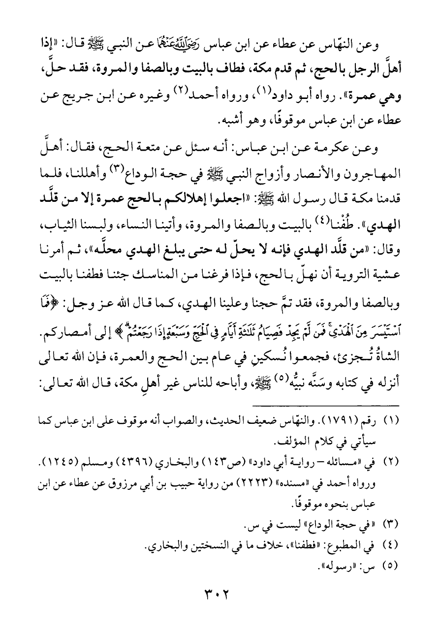 وعن النهّاس عن عطاء عن ابن عباس - رضي الله عنهما - عن النبي - صلى الله عليه وسلم - قال: «إذا أهلَّ الرجل بالحج، ثم قدم مكة، فطاف بالبيت وبالصفا والمروة، فقد حلَّ، وهي عمرة». رواه أبو داود (¬١)، ورواه أحمد (¬٢) وغيره عن ابن جريج عن عطاء عن ابن عباس موقوفًا، وهو أشبه.