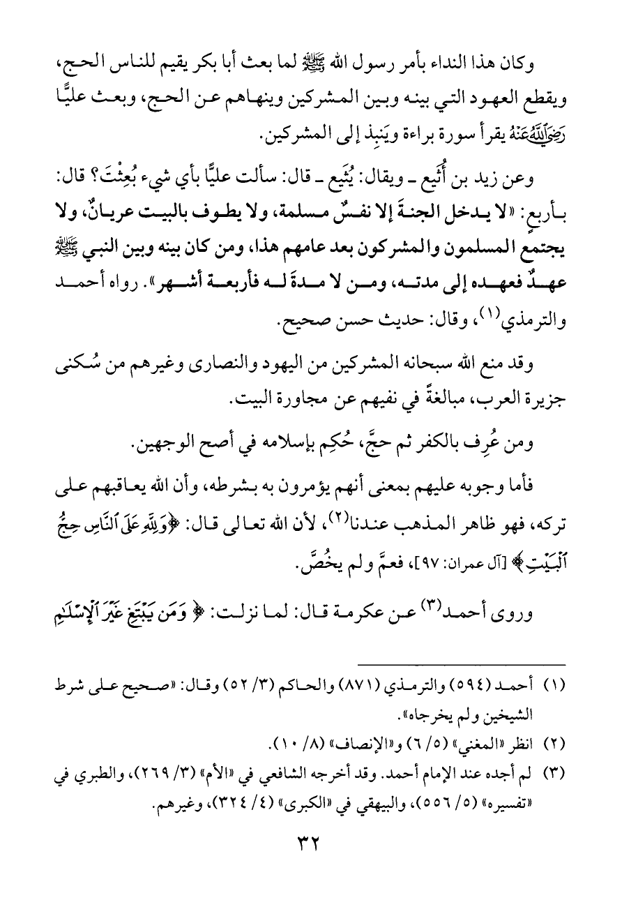 وعن زيد بن أُثَيع ــ ويقال: يُثَيع ــ قال: سألت عليًّا بأي شيء بُعِثْتَ؟ قال: بأربعٍ: «لا يدخل الجنةَ إلا نفسٌ مسلمة، ولا يطوف بالبيت عريانٌ، ولا يجتمع المسلمون والمشركون بعد عامهم هذا، ومن كان بينه وبين النبي - صلى الله عليه وسلم - عهدٌ فعهده إلى مدته، ومن لا مدةَ له فأربعة أشهر». رواه أحمد والترمذي (¬١)، وقال: حديث حسن صحيح.