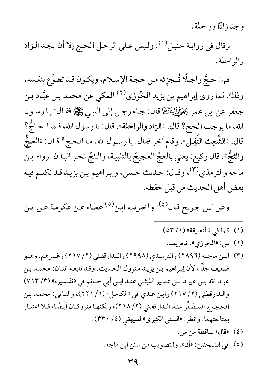 فإن حجَّ راجلًا تُجزِئه من حجة الإسلام، ويكون قد تطوَّع بنفسه، وذلك لما روى إبراهيم بن يزيد الخُوزي (¬٢) المكي عن محمد بن عبَّاد بن جعفر عن ابن عمر - رضي الله عنهما - قال: جاء رجل إلى النبي - صلى الله عليه وسلم - فقال: يا رسول الله، ما يوجب الحج؟ قال: «الزاد والراحلة». قال: يا رسول الله، فما الحاجُّ؟ قال: «الشَّعِث التَّفِل». وقام آخر فقال: يا رسول الله، ما الحج؟ قال: «العجُّ والثجُّ». قال وكيع: يعني بالعجّ العجيجَ بالتلبية، والثجّ نحر البدن. رواه ابن ماجه والترمذي (¬٣)، وقال: حديث حسن، وإبراهيم بن يزيد قد تكلم فيه بعض أهل الحديث من قبل حفظه.