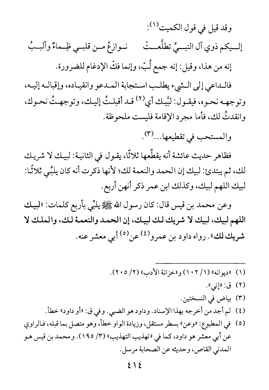 وعن محمد بن قيس قال: كان رسول الله - صلى الله عليه وسلم - يلبِّي بأربع كلمات: «لبيك اللهم لبيك، لبيك لا شريك لك لبيك، إن الحمد والنعمة لك، والملك لا شريك لك». رواه داود بن عمرو (¬٤) عن (¬٥) أبي معشر عنه.