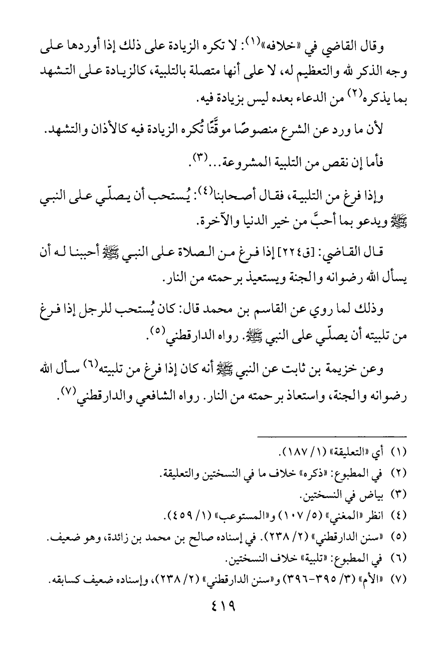 وذلك لما روي عن القاسم بن محمد قال: كان يُستحب للرجل إذا فرغ من تلبيته أن يصلّي على النبي - صلى الله عليه وسلم -. رواه الدارقطني (¬٥).
