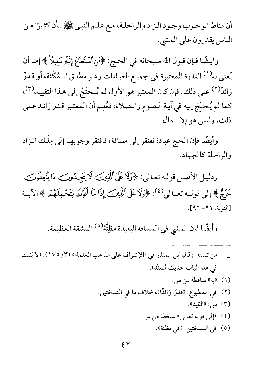 أن مناط الوجوب وجود الزاد والراحلة، مع علم النبي - صلى الله عليه وسلم - بأن كثيرًا من الناس يقدرون على المشي.