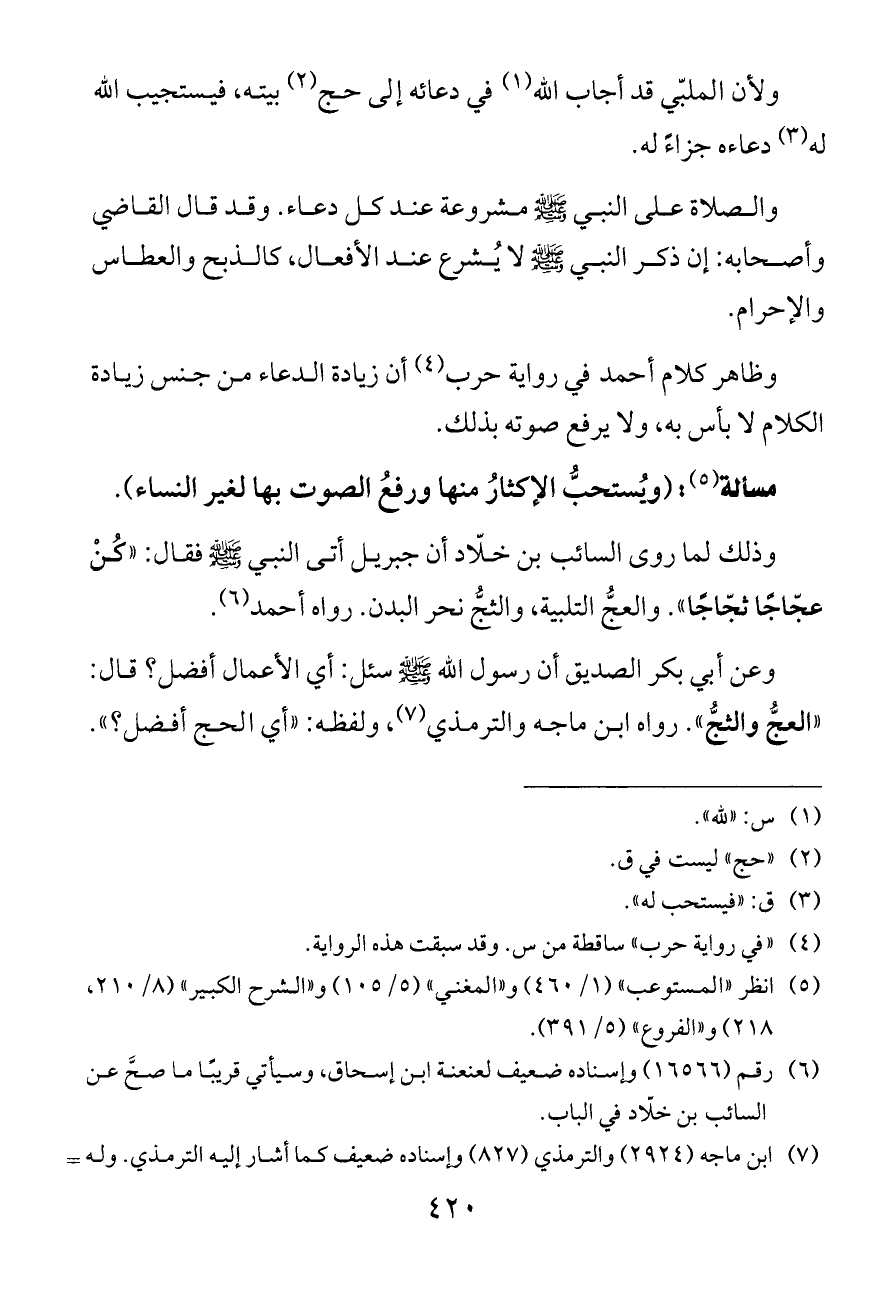 وعن أبي بكر الصديق أن رسول الله - صلى الله عليه وسلم - سئل: أي الأعمال أفضل؟ قال: «العجُّ والثجُّ». رواه ابن ماجه والترمذي (¬٧)، ولفظه: «أي الحج أفضل؟».