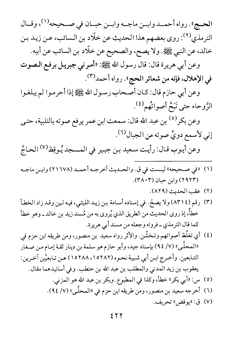 الحج». رواه أحمد وابن ماجه وابن حبان في صحيحه (¬١)، وقال الترمذي (¬٢): روى بعضهم هذا الحديث عن خلّاد بن السائب، عن زيد بن خالد، عن النبي - صلى الله عليه وسلم -. ولا يصح، والصحيح عن خلّاد بن السائب عن أبيه.