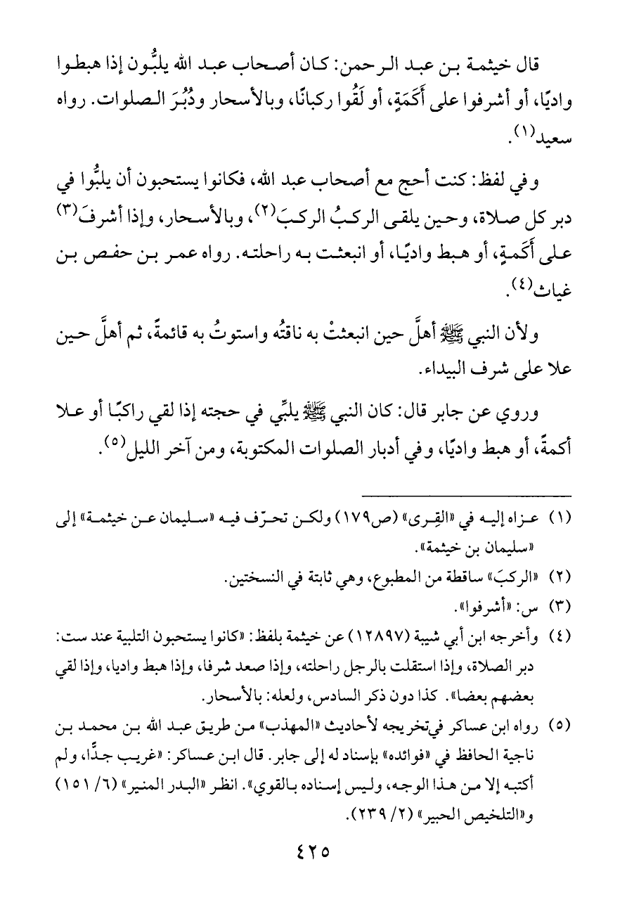 (¬٤) وأخرجه ابن أبي شيبة (١٢٨٩٧) عن خيثمة بلفظ: «كانوا يستحبون التلبية عند ست: دبر الصلاة، وإذا استقلت بالرجل راحلته، وإذا صعد شرفا، وإذا هبط واديا، وإذا لقي بعضهم بعضا». كذا دون ذكر السادس، ولعله: بالأسحار.