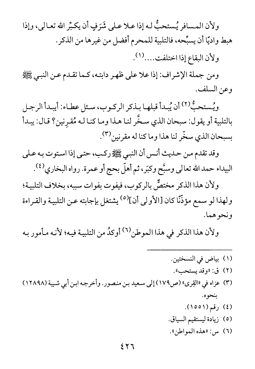 ولأن المسافر يُستحبُّ له إذا علا على شَرَفٍ أن يكبِّر الله تعالى، وإذا هبط واديًا أن يسبِّحه، فالتلبية للمحرم أفضل من غيرها من الذكر.