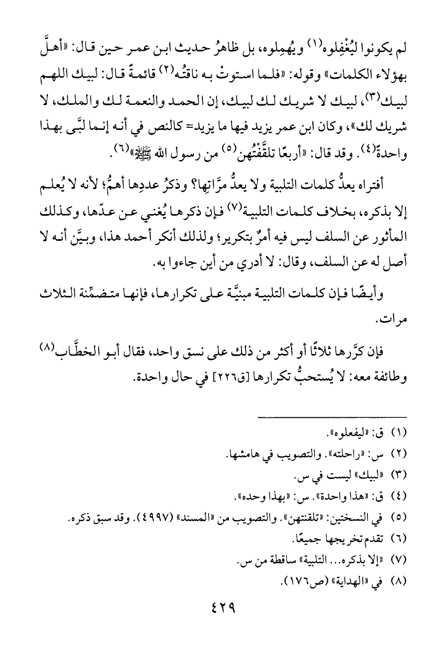 أفتراه يعدُّ كلمات التلبية ولا يعدُّ مرَّاتِها؟ وذكرُ عددِها أهمُّ؛ لأنه لا يُعلم إلا بذكره، بخلاف كلمات التلبية (¬٧) فإن ذكرها يُغني عن عدّها، وكذلك المأثور عن السلف ليس فيه أمرٌ بتكرير؛ ولذلك أنكر أحمد هذا، وبيَّن أنه لا أصل له عن السلف، وقال: لا أدري من أين جاءوا به.