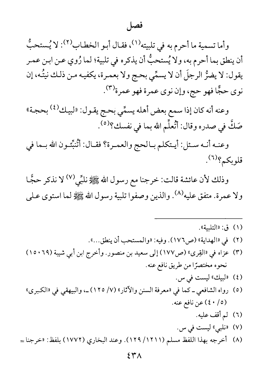 وأما تسمية ما أحرم به في تلبيته (¬١)، فقال أبو الخطاب (¬٢): لا يُستحبُّ أن ينطق بما أحرم به، ولا يُستحبُّ أن يذكره في تلبية؛ لما رُوي عن ابن عمر يقول: لا يضرُّ الرجلَ أن لا يسمِّي بحج ولا بعمرة، يكفيه من ذلك نيتُه، إن نوى حجًّا فهو حج، وإن نوى عمرة فهو عمرة (¬٣).