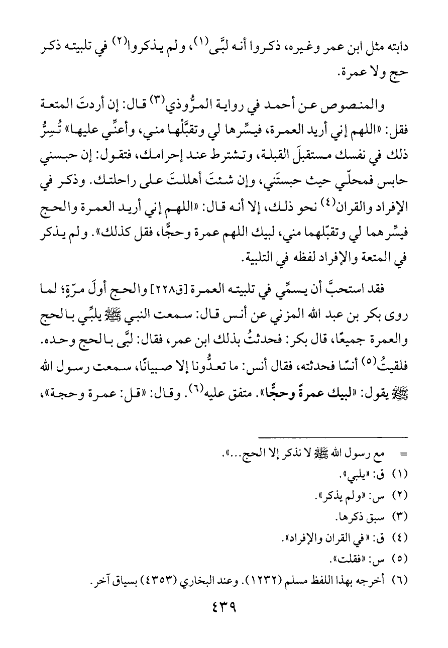 والمنصوص عن أحمد في رواية المرُّوذي (¬٣) قال: إن أردتَ المتعة فقل: «اللهم إني أريد العمرة، فيسِّرها لي وتقبَّلْها مني، وأعنِّي عليها» تُسِرُّ ذلك في نفسك مستقبلَ القبلة، وتشترط عند إحرامك، فتقول: إن حبسني حابس فمحلّي حيث حبستَني، وإن شئتَ أهللتَ على راحلتك. وذكر في الإفراد والقران (¬٤) نحو ذلك، إلا أنه قال: «اللهم إني أريد العمرة والحج فيسِّرهما لي وتقبّلهما مني، لبيك اللهم عمرة وحجًّا، فقل كذلك». ولم يذكر في المتعة والإفراد لفظه في التلبية.