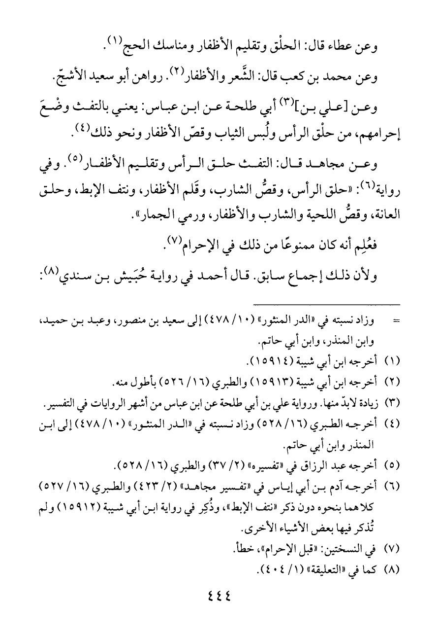 (¬٦) أخرجه آدم بن أبي إياس في «تفسير مجاهد» (٢/ ٤٢٣) والطبري (١٦/ ٥٢٧) كلاهما بنحوه دون ذكر «نتف الإبط»، وذُكِر في رواية ابن أبي شيبة (١٥٩١٢) ولم تُذكر فيها بعض الأشياء الأخرى.