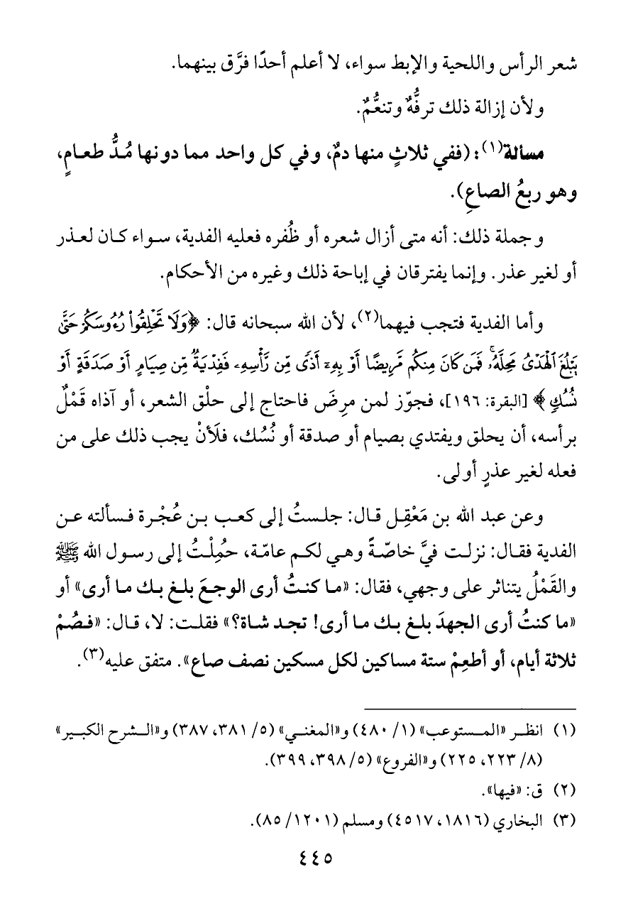 وعن عبد الله بن مَعْقِل قال: جلستُ إلى كعب بن عُجْرة فسألته عن الفدية فقال: نزلت فيَّ خاصّةً وهي لكم عامّة، حُمِلْتُ إلى رسول الله - صلى الله عليه وسلم - والقَمْلُ يتناثر على وجهي، فقال: «ما كنتُ أرى الوجعَ بلغ بك ما أرى» أو «ما كنتُ أرى الجهدَ بلغ بك ما أرى! تجد شاة؟» فقلت: لا، قال: «فصُمْ ثلاثة أيام، أو أطعِمْ ستة مساكين لكل مسكين نصف صاع». متفق عليه (¬٣).