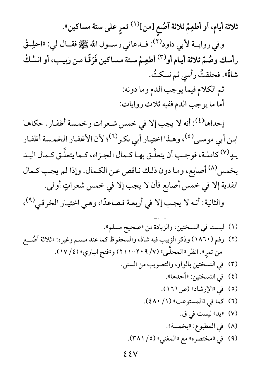 وفي رواية لأبي داود (¬٢): فدعاني رسول الله - صلى الله عليه وسلم - فقال لي: «احلِقْ رأسك وصُمْ ثلاثة أيام أو (¬٣) أطعِمْ ستة مساكين فَرَقًا من زبيب، أو انسُكْ شاةً». فحلقتُ رأسي ثم نسكتُ.