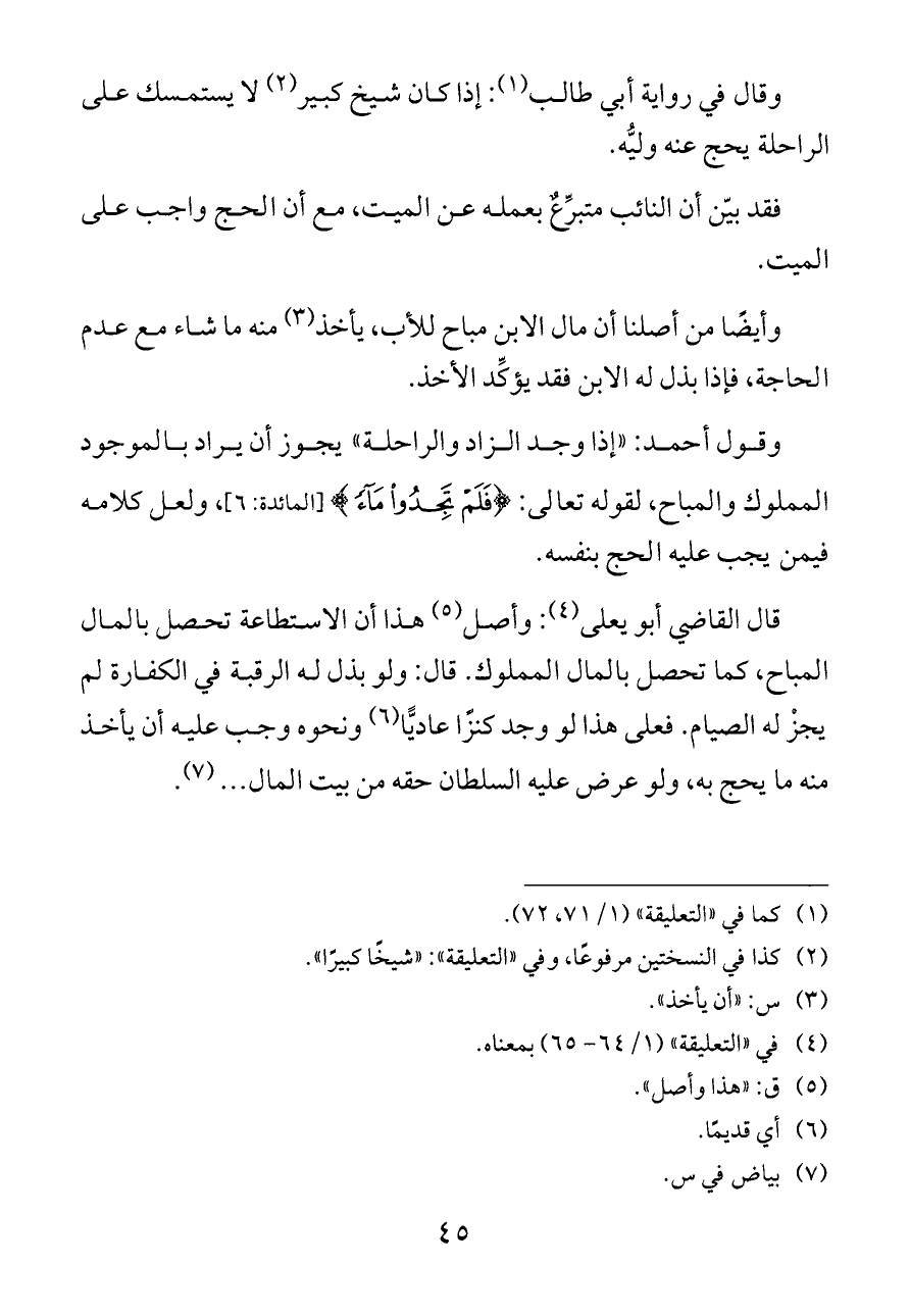 وقول أحمد: «إذا وجد الزاد والراحلة» يجوز أن يراد بالموجود المملوك والمباح، لقوله تعالى: {فَلَمْ تَجِدُوا مَاءً} [المائدة: ٦]، ولعل كلامه فيمن يجب عليه الحج بنفسه.