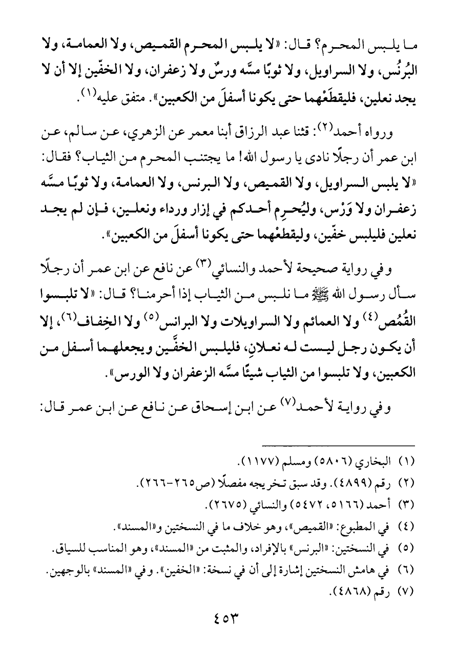 ورواه أحمد (¬٢): قثنا عبد الرزاق أبنا معمر عن الزهري، عن سالم، عن ابن عمر أن رجلًا نادى يا رسول الله! ما يجتنب المحرم من الثياب؟ فقال: «لا يلبس السراويل، ولا القميص، ولا البرنس، ولا العمامة، ولا ثوبًا مسَّه زعفران ولا وَرْس، وليُحرِم أحدكم في إزار ورداء ونعلين، فإن لم يجد نعلين فليلبس خفّين، وليقطعْهما حتى يكونا أسفلَ من الكعبين».
