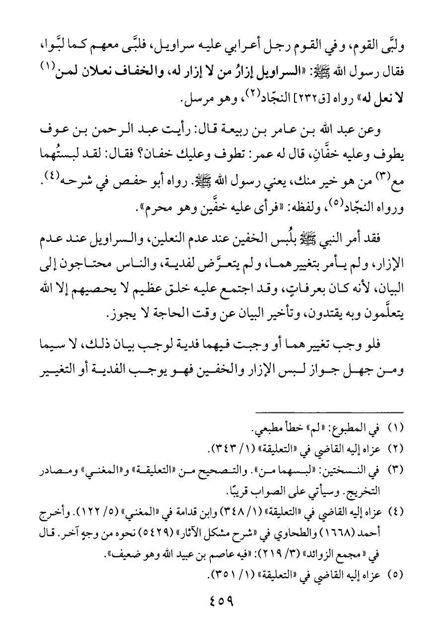 ولبَّى القوم، وفي القوم رجل أعرابي عليه سراويل، فلبَّى معهم كما لبَّوا، فقال رسول الله - صلى الله عليه وسلم -: «السراويل إزارُ من لا إزار له، والخفاف نعلان لمن (¬١) لا نعل له» رواه [ق ٢٣٢] النجّاد (¬٢)، وهو مرسل.